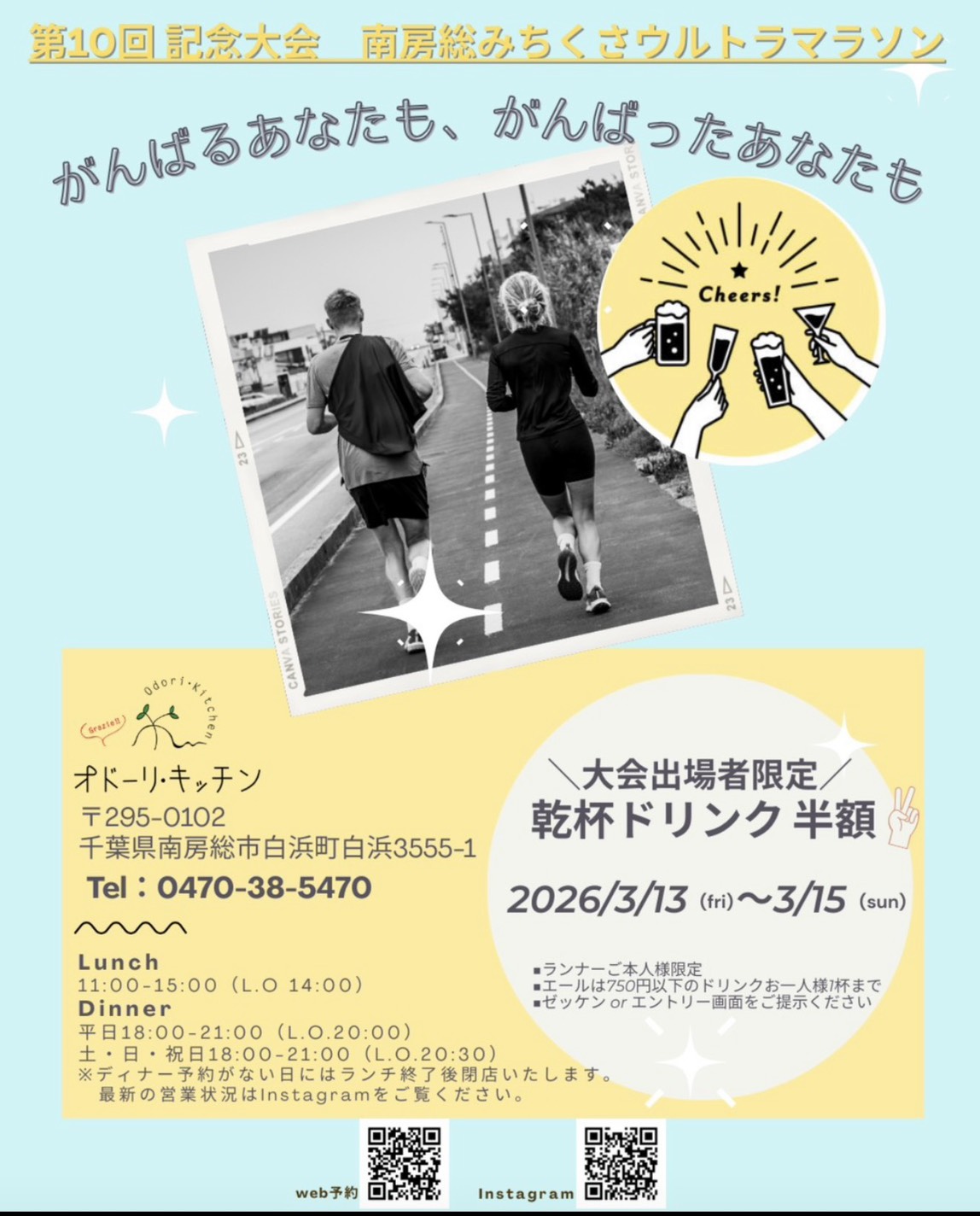 大会前日の3/13(金)~大会後の3/15(日)までランナーの皆さんに【乾杯ドリンクを一杯サービス】いたしますので、是非ともお立ち寄りくださいませ!